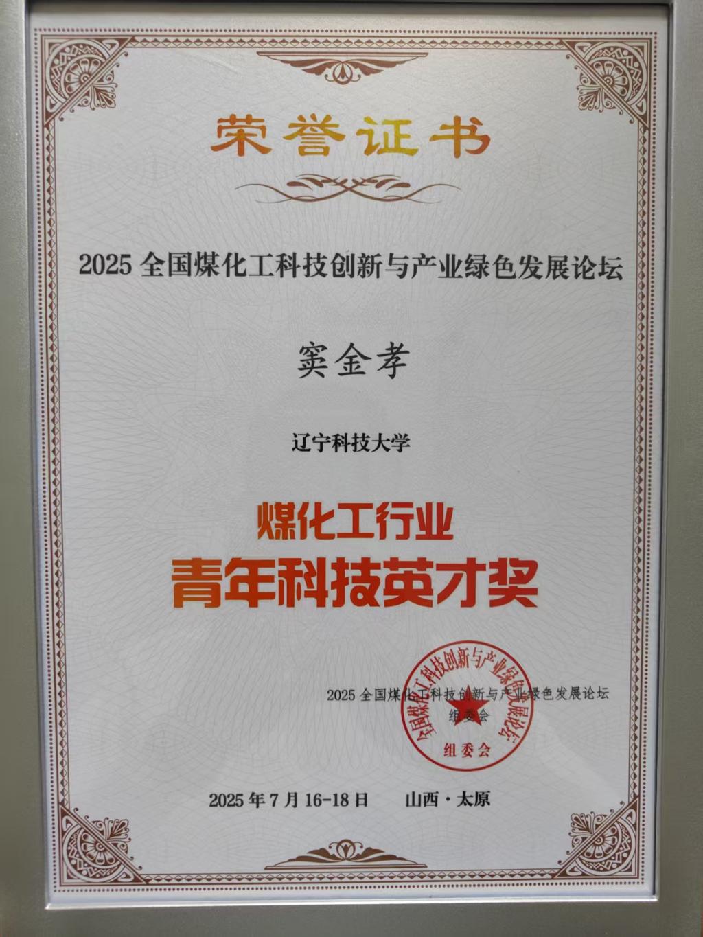 会上,化工学院周卫民和窦金孝两位老师分别作题为《光催化剂/复合球形活性炭在绿色养殖中的应用》的大会报告和《粉煤灰制备X沸石负载Cu基催化剂及其NH3-SCR脱硝性能》的分会场特邀报告,窦金孝副教授荣获“煤化工行业青年科技英才奖”荣誉称号。