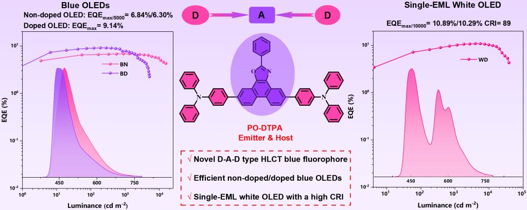 蓝色电致发光材料由于其短波发光的特性,部分材料在实现自身蓝光发射的同时还可以作为主体,为长波长(红、黄和绿光)客体传递能量。这些蓝光多功能材料对于实现低成本全色和白光OLEDs具有巨大的优势。近年来,研究人员报道了大量的蓝色多功能材料并成功应用于全色和白光OLEDs。然而,蓝色多功能材料的性能仍然难以令人满意,面临诸多挑战。这些潜在的问题和研究方向需要进一步解决和探索。课题组以菲并噁唑为构筑单元,开发了一种新型D-A-D型蓝光材料PO-DTPA。该材料展现出平衡的局域杂化电荷转移性质以及T7S1的高效热激子通道。最终,基于PO-DTPA的蓝光非掺杂/掺杂器件展现了优异的性能,并在高亮度下表现出低的效率滚降。同时,通过在该多功能材料中掺杂低浓度的黄色磷光客体,成功制备了单发光层结构的双色白光OELDs。该器件实现了色坐标为(0.31, 0.29)的白光发射和高达89的显色指数。