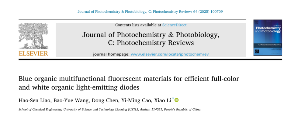该工作基于菲并噁唑基团开发了一种新型的蓝色多功能荧光材料,并在蓝光器件和双色白光器件的应用中取得了优异性能,为构建高效蓝色多功能材料和低成本白光OLEDs提供了可行的策略。这项成果是在辽宁省高校功能材料重点实验室开放课题基金支持下取得的突破。此前,课题组已在《Journal of Photochemistry & Photobiology, C: Photochemistry Reviews》(中科院一区TOP, IF=13.2)发表题为“Blue organic multifunctional fluorescent materials for efficient full-color and white organic light-emitting diodes”的综述论文,为新型高性能蓝色多功能材料的开发提供了参考。