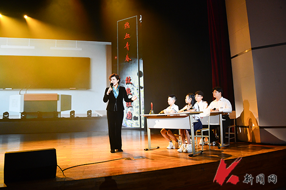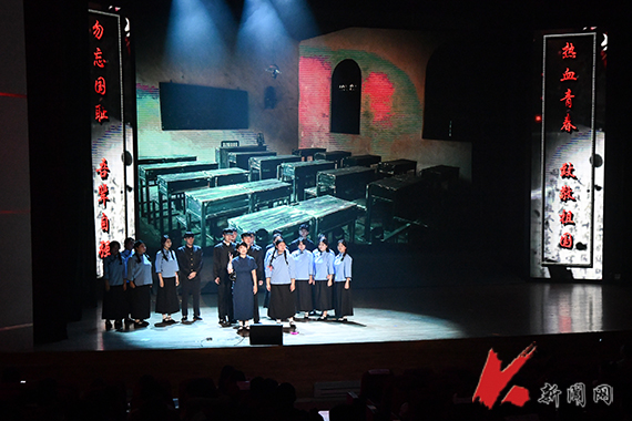 随着手摇上课铃声响起,“今课堂”带领师生们在80年的光阴中穿梭往返,回味那些难忘的峥嵘岁月和奋斗不息的青春。经典抗日歌曲《松花江上》,以苍凉旋律唤醒“勿忘国耻”的集体记忆。《救亡进行曲》唱出了“天下兴亡,匹夫有责”的担当与爱国情怀,振奋人心、鼓舞士气。《弹起我心爱的土琵琶》《毛主席的话儿记心上》等红色经典影片中的插曲,传递出游击队员在艰苦环境中的坚强意志和乐观精神。波澜壮阔的中国抗战史,就是一部英雄史,快板表演《白山黑水英雄谱》歌颂了杨靖宇、赵一曼、赵尚志在中国人民艰苦卓绝的浴血奋战中,用鲜血和生命筑起拯救民族危亡、捍卫民族尊严的钢铁长城的英雄事迹。情景剧《出征》里,老槐村的热血青年挺身而出,挥洒青春,他们没有走上回家的路,但铺出了一条山河无恙、草木葱茏的路。配乐朗诵《英雄》深情豪迈,情感真挚地表达了英雄没有高低贵贱之分,只要背上有傲骨,只要胸中有担当,都可以成为这个伟大复兴时代响当当的英雄。压轴曲目《请党放心 强国有我》唱出青春最美的模样,铿锵誓言在舞台上空回响,将课堂气氛推向高潮。活动中,师生们深情演绎,铭记历史,缅怀先烈,弘扬伟大抗战精神,共同完成了一次关于信仰、关于理想、关于家国的深情对话,彰显新时代青年的使命担当。
